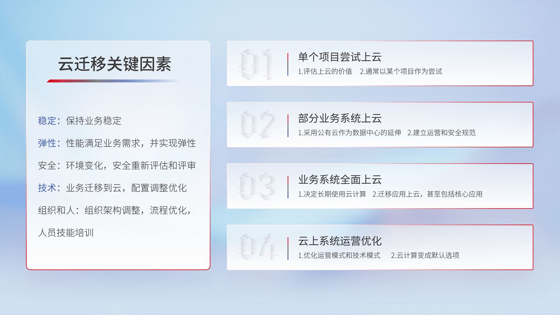 结合实际业务,,,,从规划设计、、、、云平台选型、、、云原生改造、、、、数据迁移、、、、集成交付,,迁移全过程为客户识别最佳上云路径,,,做好风险识别管理,,,设计网络架构、、、身份权限、、、安全审计合规、、、、操作审计、、日志审计、、监控告警策略、、多站点容灾设计等,,,,对云上基础设施进行整体规划,,提升IT治理水平,,以满足弹性、、、、高可用、、高性能的需求。。。。
